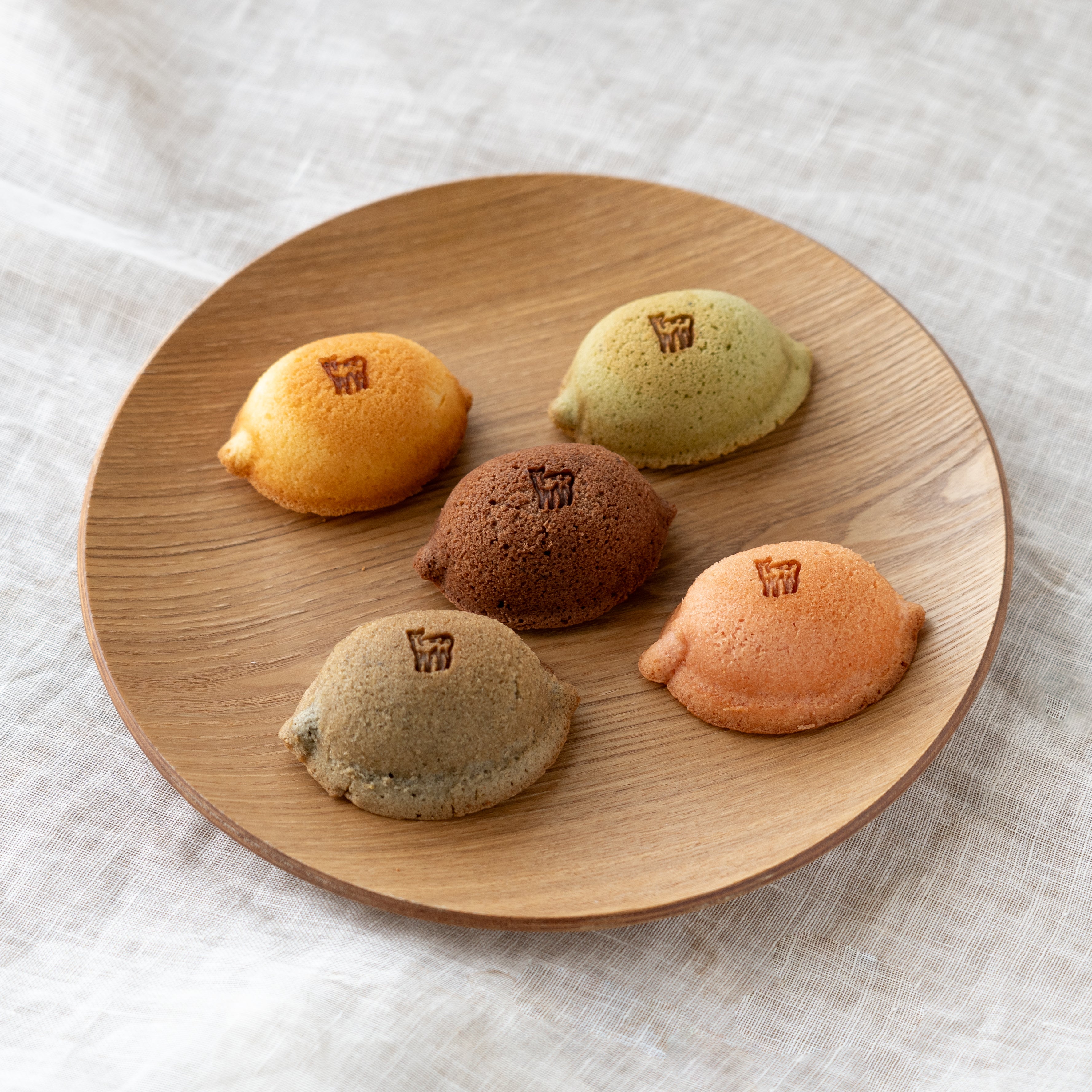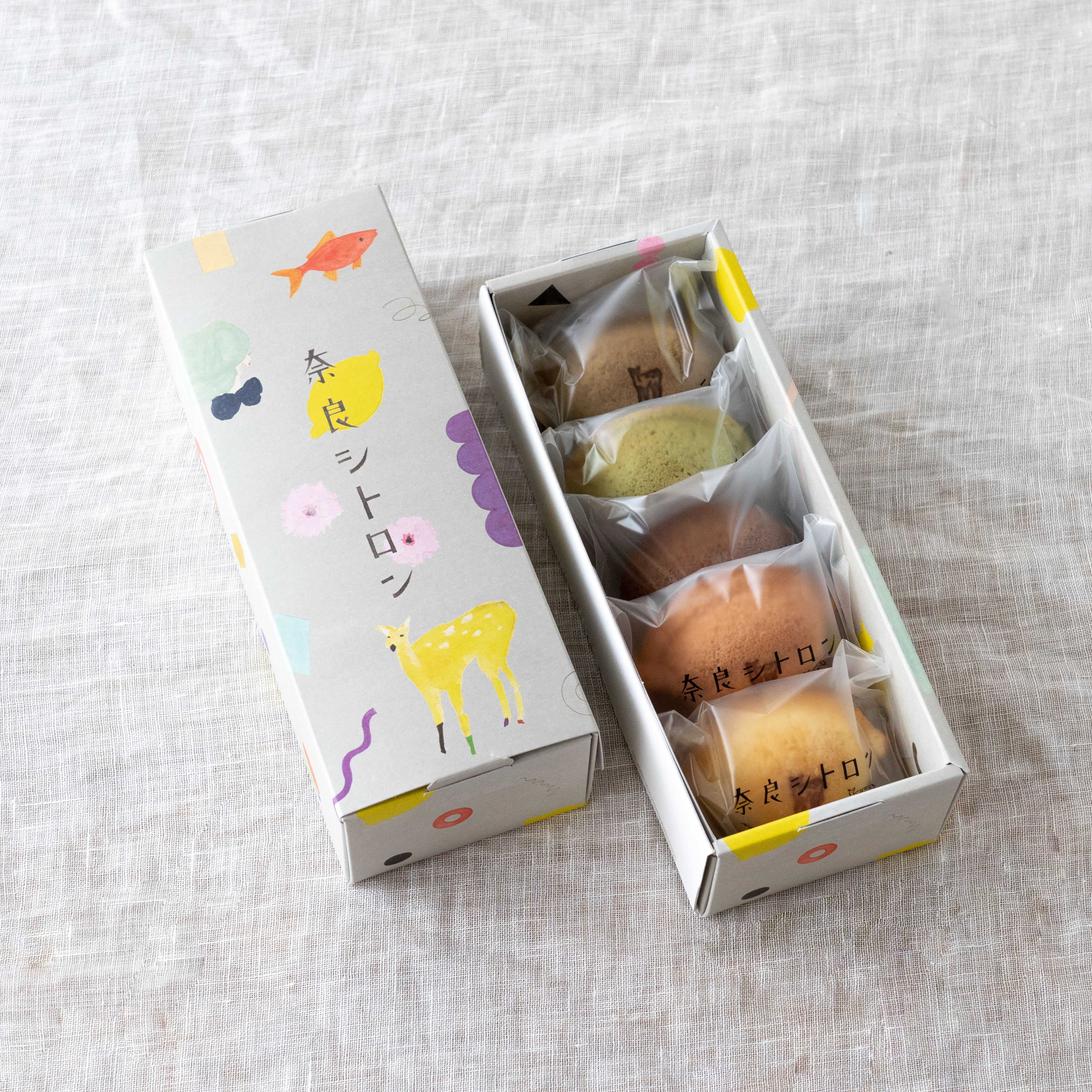 「週末シトロン」と同じ製法で作られた小さなケーキ。抹茶・ごま・いちご・チョコ・レモンの5種類の味が楽しめます。奈良でしか買えない限定パッケージに入った、持ち帰りやすい5個セットは観光のお土産にピッタリです。