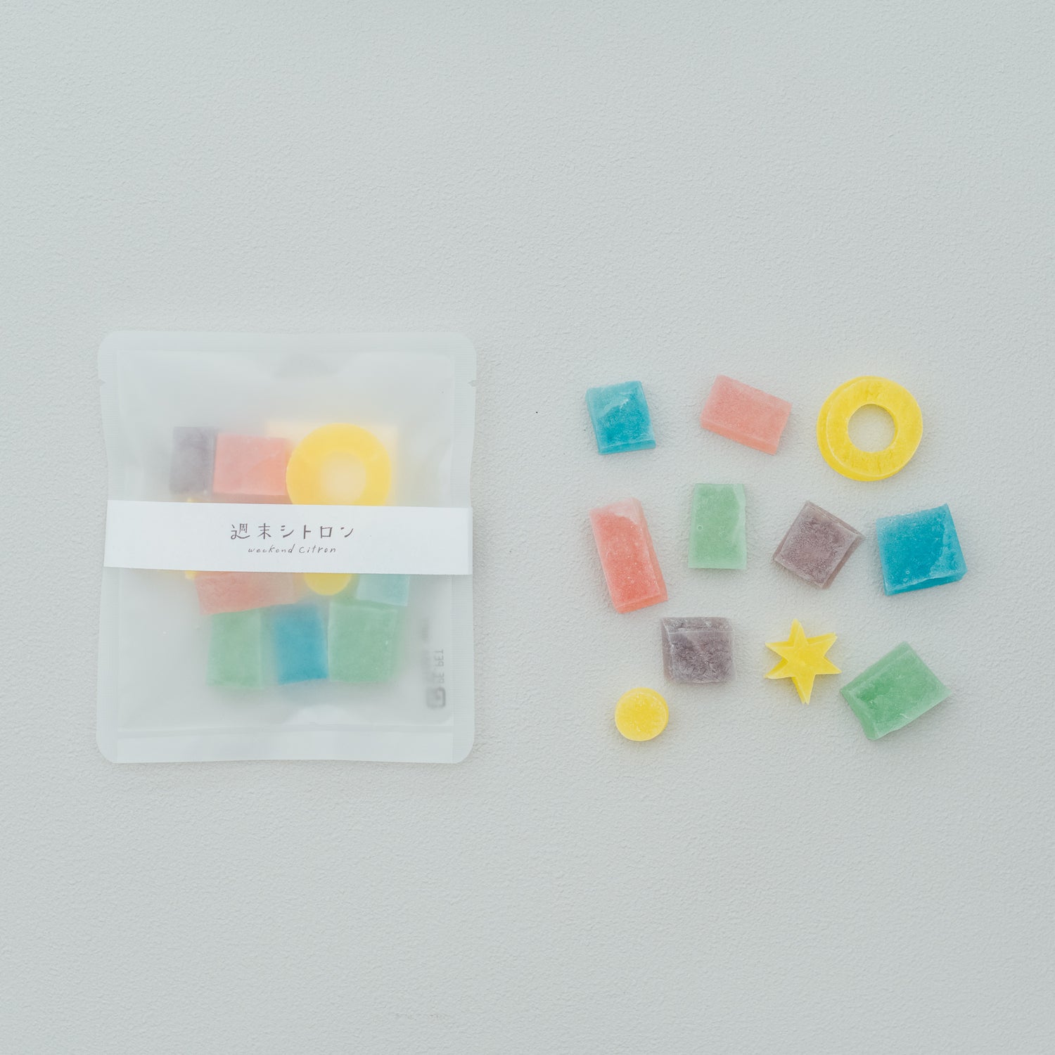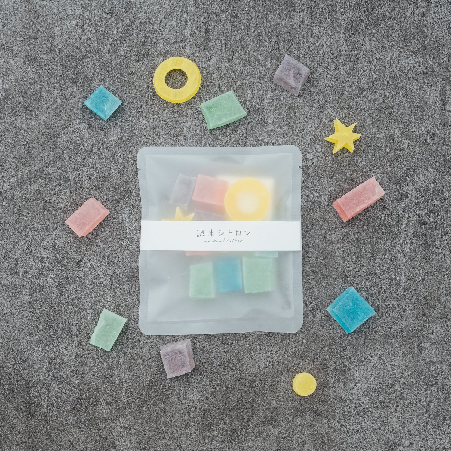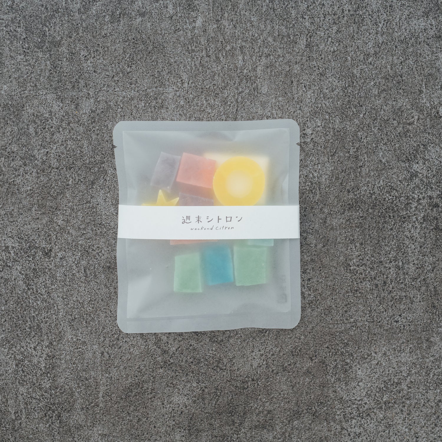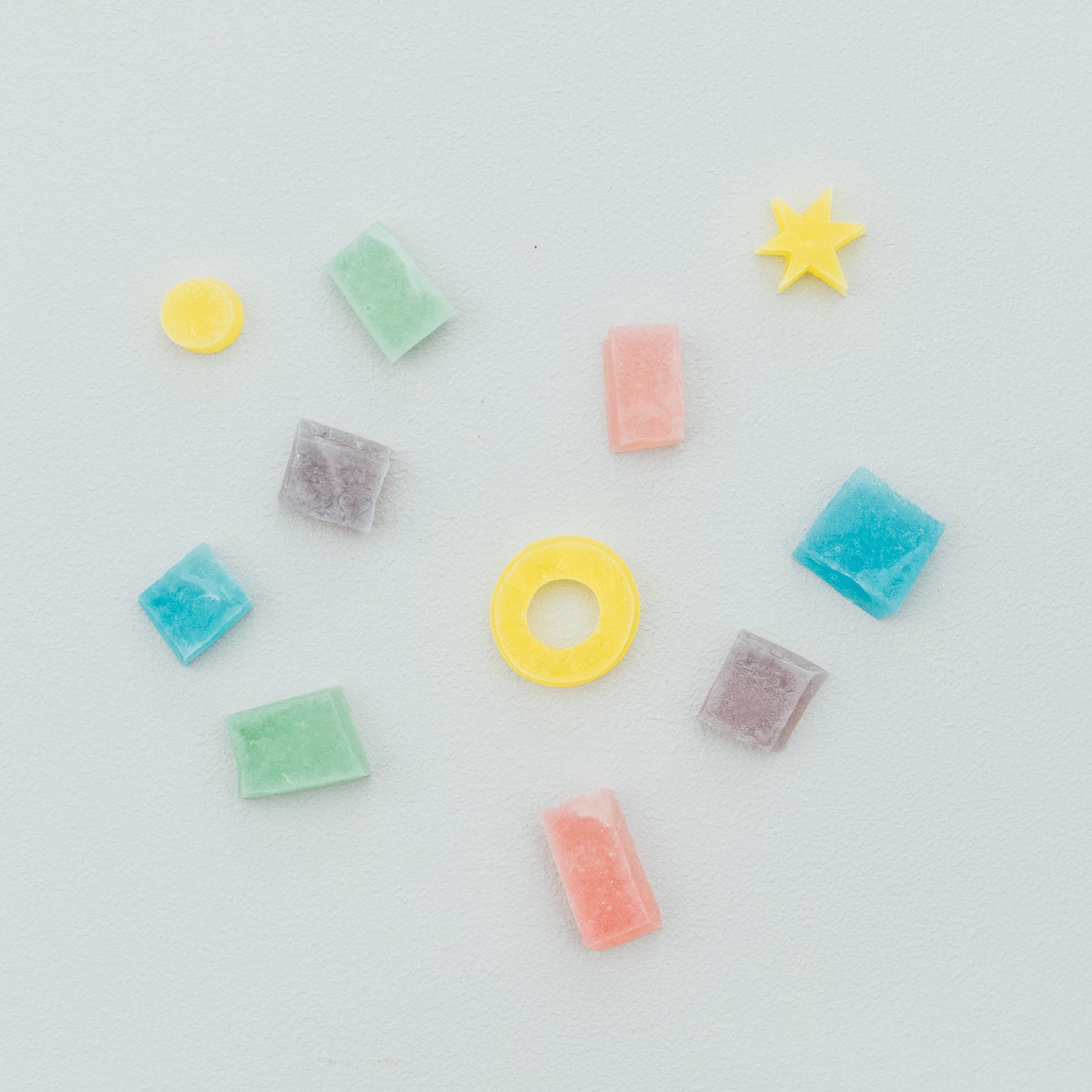 絶妙な配色の色と、丸や星などの形がとってもかわいい手作りの琥珀糖。